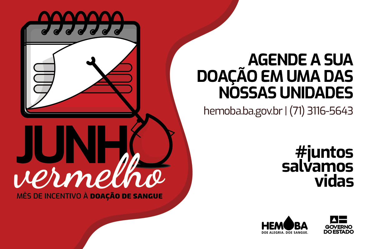 Para sensibilizar a população sobre a importância da doação regular de sangue, a Organização Mundial de Saúde (OMS) criou o Junho Vermelho, mês de incentivo à doação de sangue. Este ano, a hastag #JuntosSalvamosVidas foi adotada como slogan da campanha pelos hemocentros de todo o país. Na Fundação Hemoba, as ações de conscientização do Junho Vermelho começaram nessa terça (02), no Hospital Geral Roberto Santos, com a volta da unidade móvel de coleta (Hemóvel) que fica no estacionamento do hospital para atendimento dos doadores até às 17h desta sexta-feira (05).