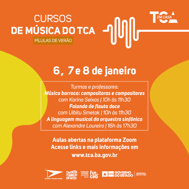 Em 2020, o Teatro Castro Alves (TCA) transferiu para o ambiente digital os seus cursos de iniciação ao universo da música sinfônica. Em três edições das turmas virtuais, 735 pessoas de várias cidades da Bahia e do Brasil puderam adentrar neste mundo, conhecendo a linguagem musical da orquestra sinfônica, os grandes compositores da música clássica e tendo iniciação à prática de instrumento de flauta doce. Agora, nos dias 6, 7 e 8 de janeiro, minicursos fazem abre-alas do novo ano, para quem desejar se introduzir no assunto, experimentar das aulas e conhecer suas metodologias. Os encontros serão abertos ao público, em salas virtuais abertas na plataforma Zoom Meeting, cujos links estão disponíveis no site www.tca.ba.gov.br
