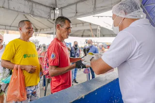 O aposentado Vitor Novaes, de 71 anos, era só alegria, enquanto aguardava ansioso na fila para receber a quentinha. “Vai ter prato diferente”, festejou. O que para o habitual frequentador do restaurante em Pau da Lima já era muito bom, hoje foi bem melhor.
