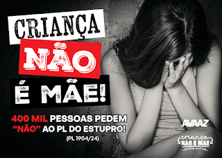 Nesta quarta-feira (19), o movimento Criança Não é Mãe realiza ato simbólico, às 14h, na entrada do Anexo II da Câmara dos Deputados, contra do Projeto de Lei 1904/2024, conhecido como PL do Aborto e PL do Estupro. A manifestação objetiva que a matéria não seja votada. Petições elaboradas pela Avaaz e pela organização Criança Não é Mãe somam mais de 400 mil assinaturas contrárias ao projeto.